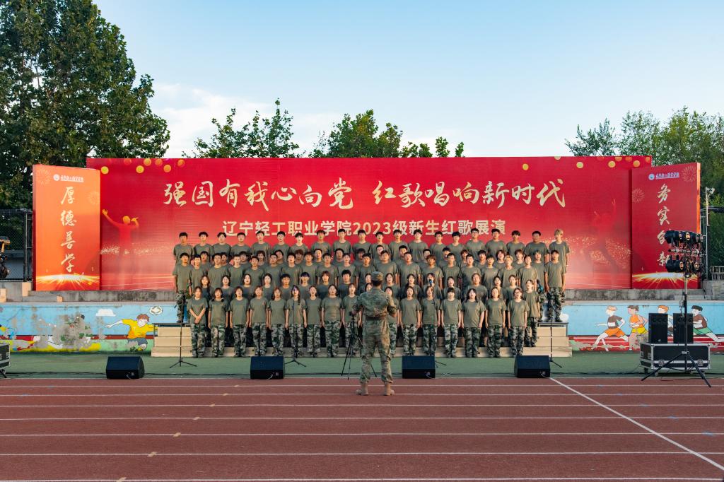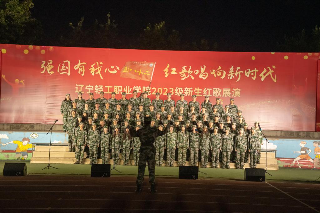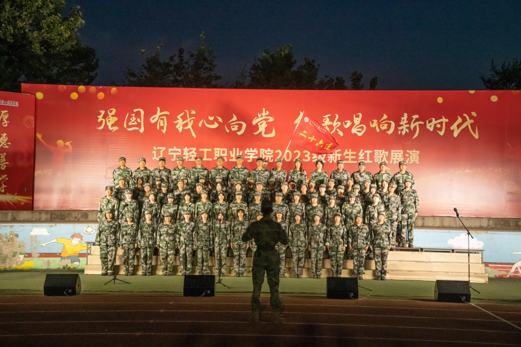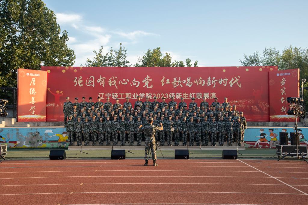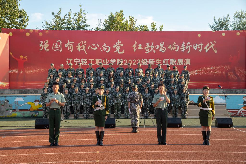 红歌展演在全体承训教官慷慨激昂的《有我在》歌声中拉开帷幕,来自六个营的三十三个连队分别选取了《没有共产党就没有新中国》、《保卫黄河》、《我们走在大路上》、《打靶归来》、《当那一天来临》、《假如战争今天爆发》、《强军战歌》、《祖国不会忘记》等红色歌曲参加展演。参演新生着装整齐、精神饱满,嘹亮的歌声饱含着对祖国的无限热爱和对党的无限忠诚,唱响了辽轻学子传承红色基因的主旋律,唱出了新时代青年的最强音,抒发了华夏儿女血脉共流的民族情怀。