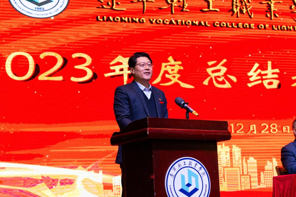 王运河代表学院党委向一年来辛勤耕耘在教学、科研、管理等一线的教职员工表示衷心地感谢,向勤奋学习、积极向上的同学们致以亲切的问候和诚挚的祝福。他表示,2023年是辽轻人“凝心铸魂,实干笃行”的逐梦之年,也是辽轻人“砥砺奋进建新功”的收获之年,这一年,既有探索的艰辛,也有拼搏的豪情,更有收获的喜悦,全体辽轻人心往一处想、智往一处谋、劲往一处使,推动学校各项事业蓬勃发展,在学校58年历史画卷上写下了精彩纷呈的新篇章。他指出,一年来,学院深入学习贯彻习近平新时代中国特色社会主义思想和党的二十大精神,坚持立德树人根本任务,深化内涵式发展,开创了新时代学院改革发展的新局面,全院师生员工按照年初确定的目标,在各个领域均取得了突破性的成绩。王运河强调,2024年是新中国成立75周年,是辽宁振兴发展的关键之年,也是学院继往开来抢抓发展机遇的重要一年,学院党政领导班子将坚持以习近平新时代中国特色社会主义思想为指导,一如既往地弘扬“无须扬鞭自奋蹄”的担当精神、“一张蓝图绘到底”的执着精神、“撸起袖子加油干”的奋斗精神,坚持“以师生为中心”的工作理念,坚持“从群众中来到群众中去”的工作作风,带领全院师生员工扎实工作、砥砺奋进,共同画好同心圆,一起跑好接力棒,齐心协力“跑出一个好成绩”,为建设幸福美丽的辽宁轻工职业学院再建新功。