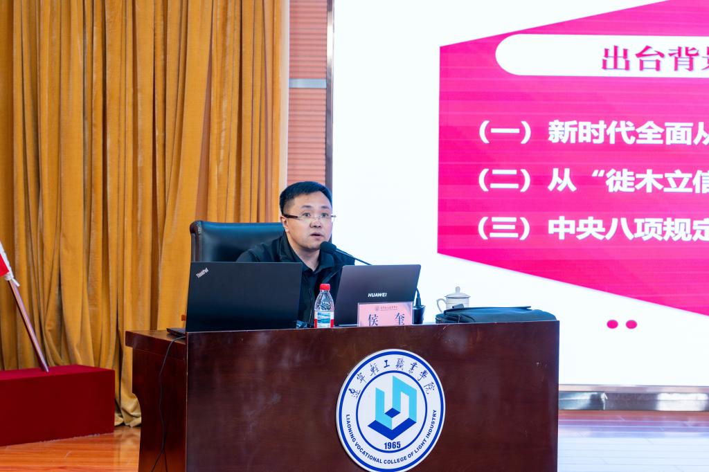 侯奎围绕“中央八项规定精神的内涵演进与时代价值、落实过程中的差距与痛点、高频场景具体分析、实践路径探索以及引领高职教育发展”五个方面,系统阐释了深入贯彻中央八项规定精神的重大意义与现实要求。辅导报告内容详实、深入浅出,既有理论高度,又有实践指导,为学院开展各项工作注入强劲保障。