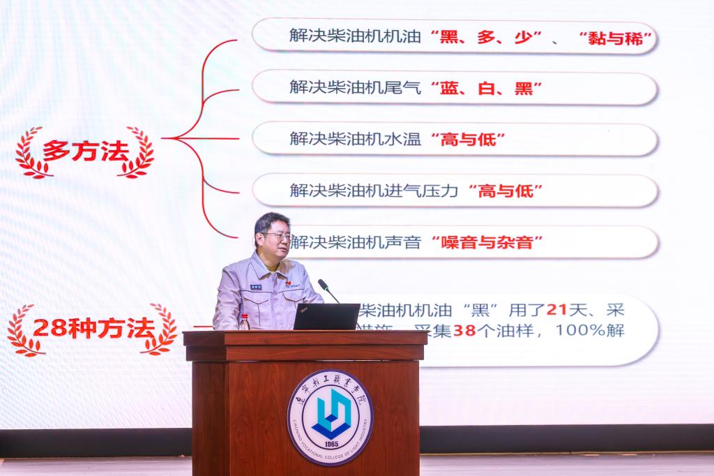 报告中,鹿新弟工程师首先讲述了自己的成长轨迹:从技校毕业步入工厂,主动拜师学艺,凭借一股不服输的钻劲深耕柴油机装调领域,最终成为业内闻名的“柴油机医生”。他结合多年一线实践,自创“看、听、摸、闻、问、测”六步维修法,快速精准判断柴油机故障,凭借这项技艺解决了上百项技术难题,先后15次荣获国际发明展览会金奖、8次荣获省部级科技进步奖,用实干诠释了“把每一件产品做到极致”的匠心。结合自身成长经历,他激励青年学子,要树立崇高人生理想,脚踏实地、久久为功,在平凡的岗位上“耐得住寂寞,坐得住冷板凳”,以精湛技能报国,用持续创新筑梦。