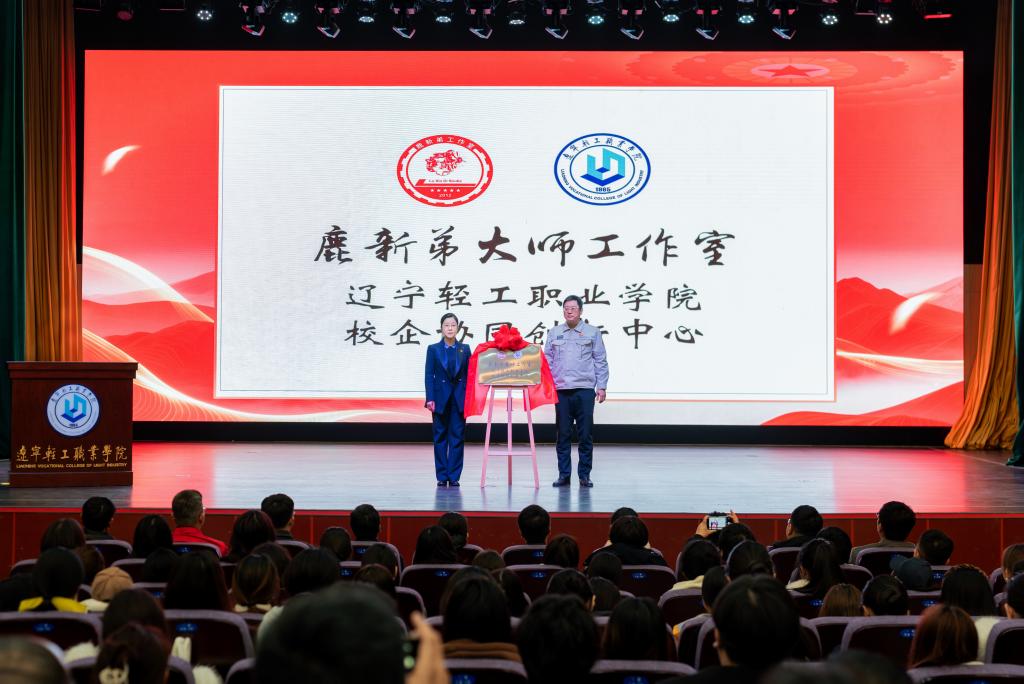 动员讲话后,石竹青与鹿新弟工程师共同为“鹿新弟大师工作室 辽宁轻工职业学院校企协同创新中心”揭牌。