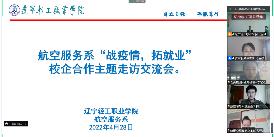 4月27日,为进一步落实国务院《职业教育改革实施方案》,促进毕业生充分、高质量就业,推进我院产教融合校企合作工作开展。航空服务系特别开展“同心战‘疫’,就业先行”校企合作企业走访交流会。孙玉红院长与中国南方航空公司大连分公司、中油阳光物业管理有限公司、中国大唐集团有限公司、大董餐饮投资有限公司、象上汇集团、大连人道生命健康技术服务中心、大连好利来食品有限公司等七家企业负责人以及航空服务系领导、教师参加本次线上座谈。