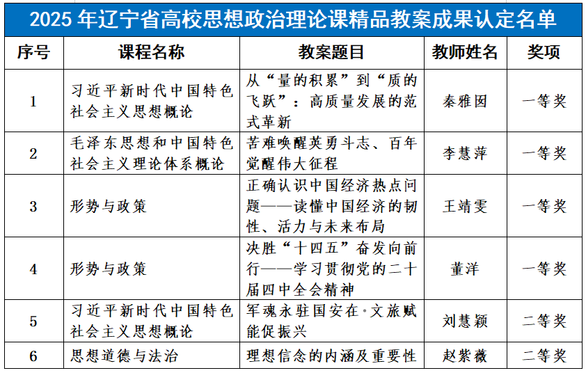 近日,辽宁省教育厅公布2025年辽宁省高校思想政治理论课精品教案认定结果,我校马克思主义学院6位思政课教师申报的教案成功上榜,获奖数量与等级均创我校参与该项评选以来的历史新高。